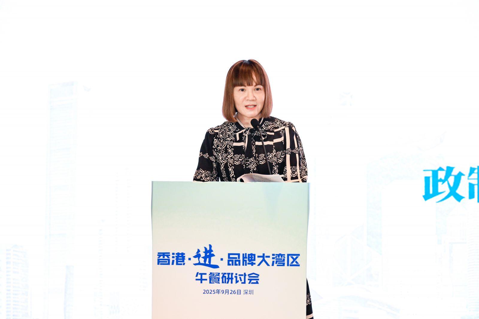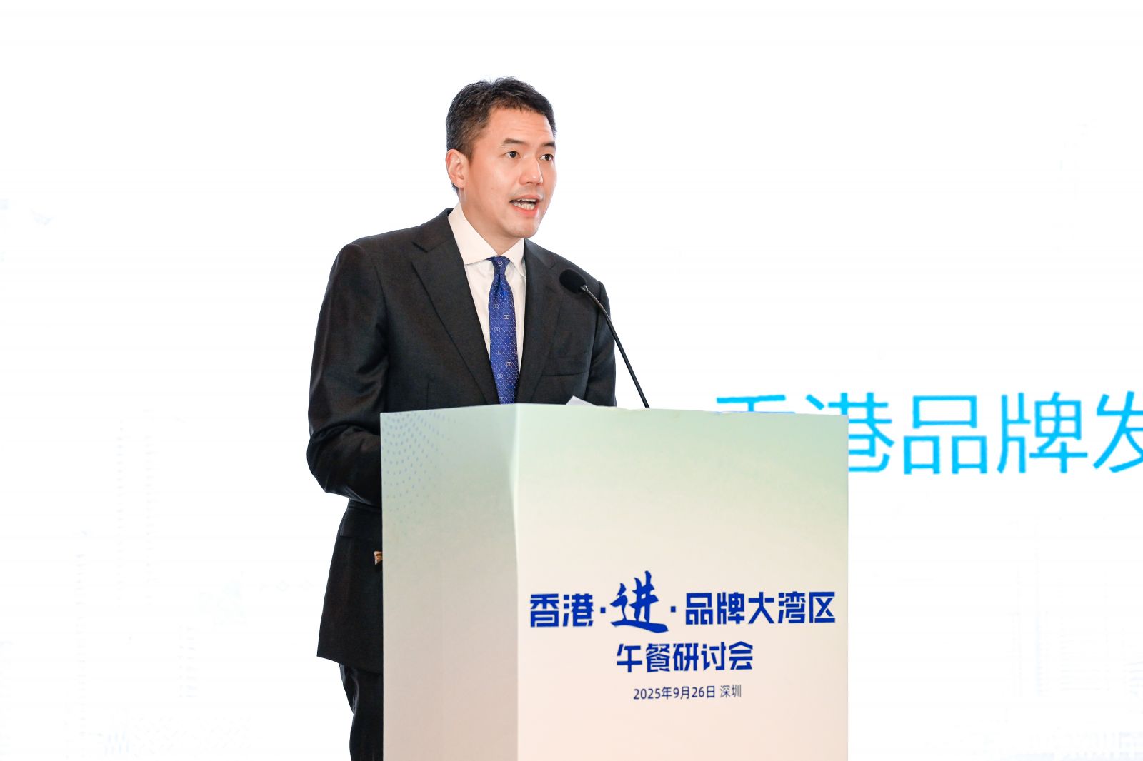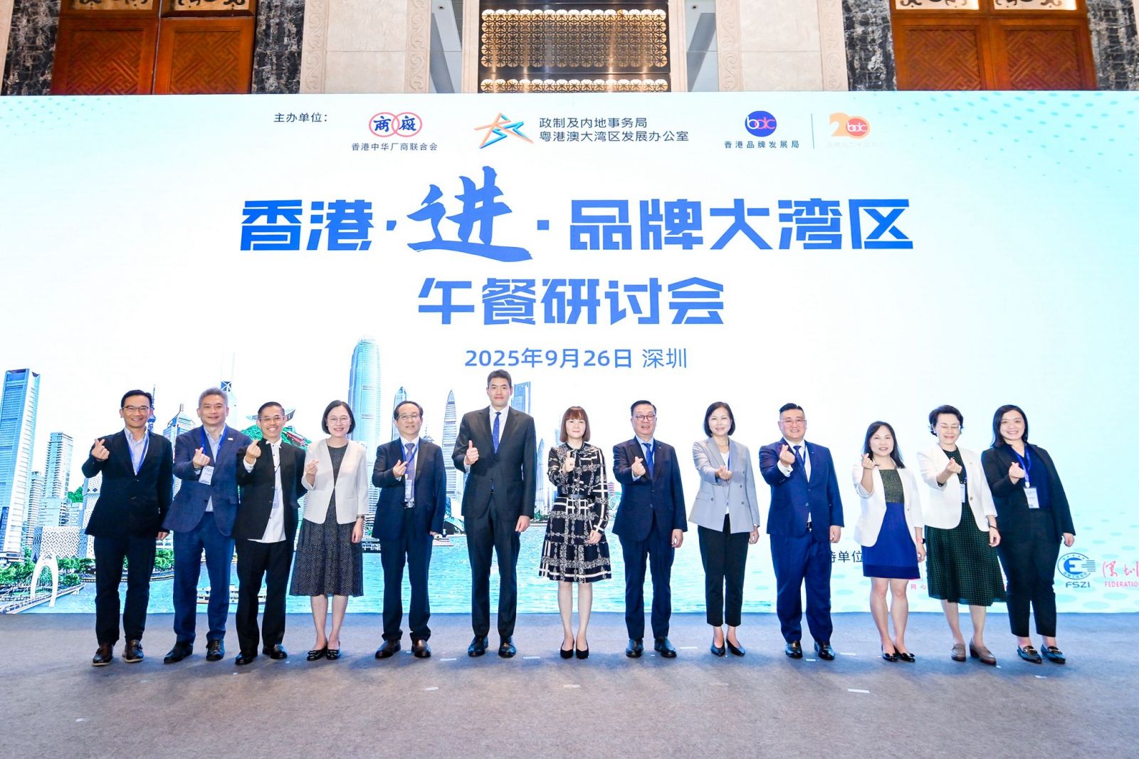 由香港品牌发展局、香港特区政府政制及内地事务局粤港澳大湾区发展办公室、及香港中华厂商联合会合办的「香港.进.品牌大湾区2025」午餐研讨会于2025年9月26日假深圳福田香格里拉大酒店宴会厅举行。是次午餐研讨旨在协助港商从多角度提升品牌塑造与营销能力,打造新质品牌力,并在竞争激烈的大湾区市场中寻找突围之道。香港特别行政区政府粤港澳大湾区发展专员陈洁玲女士及香港品牌发展局主席陈家伟MH兼香港中华厂商联合会副会长为活动致辞。
