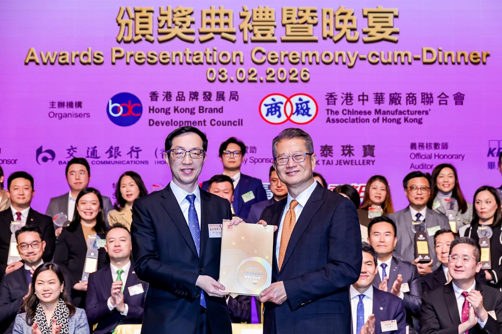 廠商會會長盧金榮(左)致送《香港名牌巡禮2025》予主禮嘉賓財政司司長陳茂波(右)。