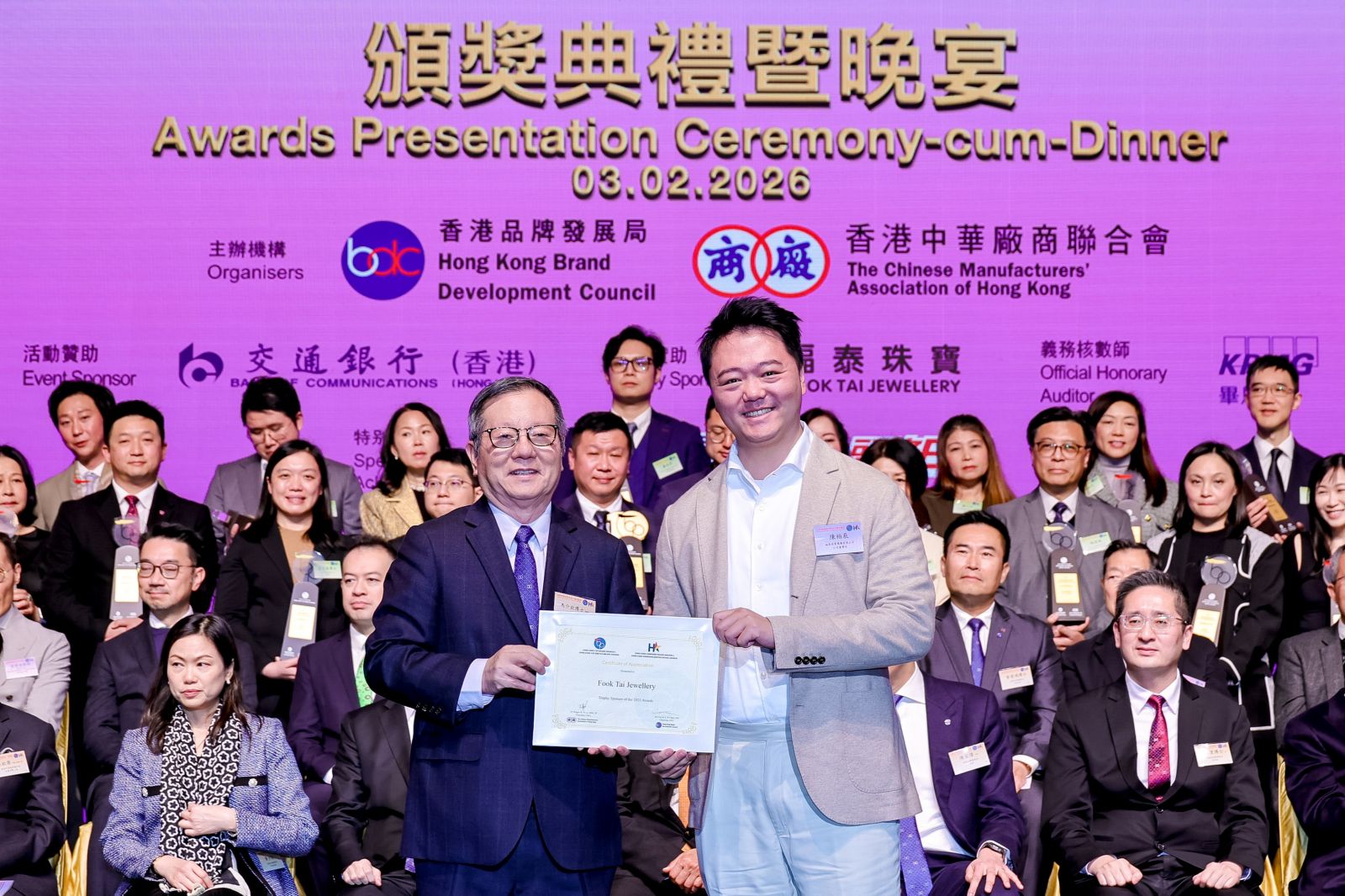 廠商會常務副會長兼品牌局副主席馬介欽致送感謝狀予2025獎座贊助商代表福泰珠寶集團有限公司董事長陳柏辰(左)。