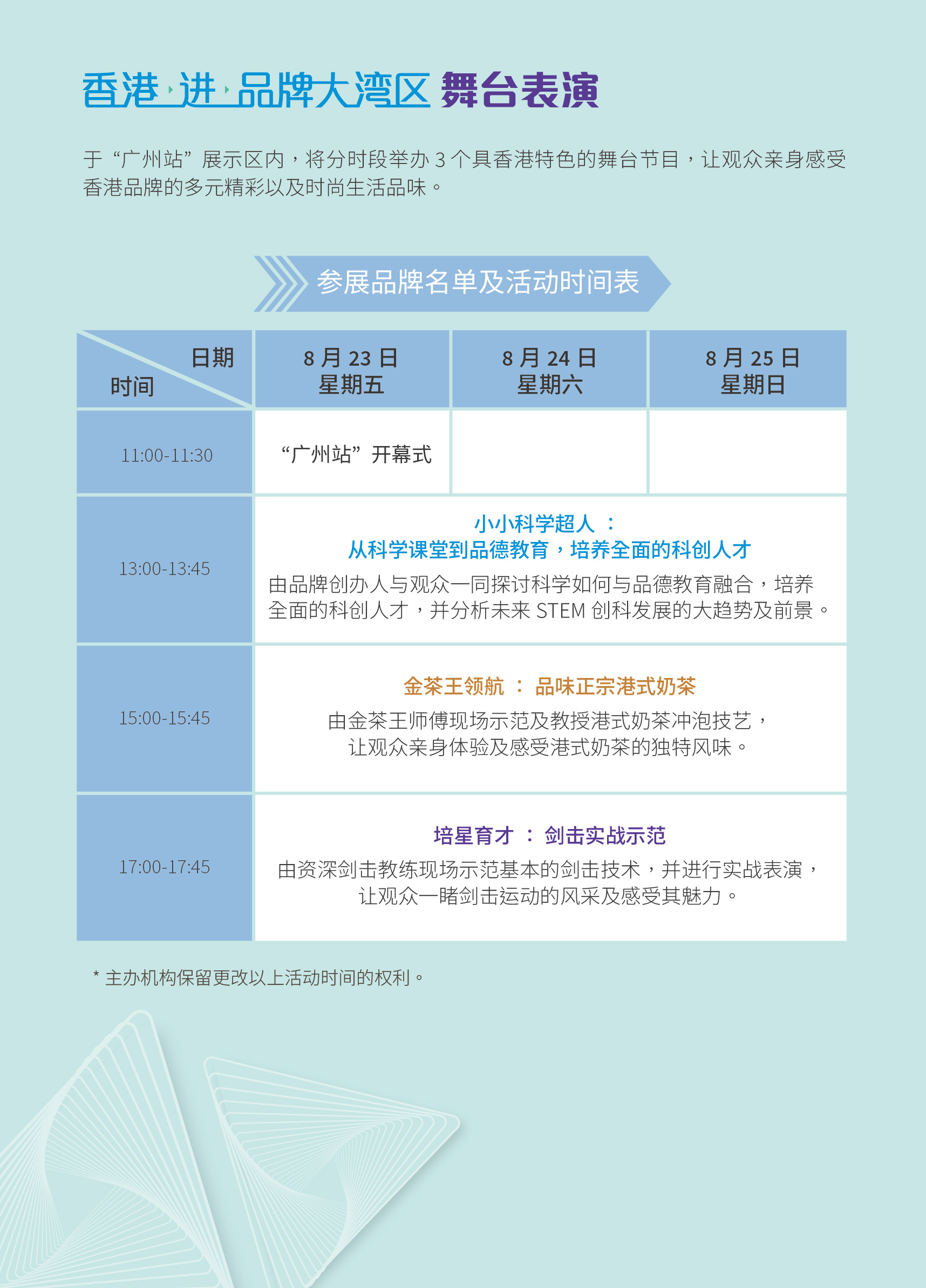 於「广州站」推行期间,在品牌形象展示区内设立舞台并举办多场具香港特色、富有动感的舞台节目,藉以展现香港品牌的多元精彩和时尚生活文化方式的精髓,并增强参观者的参与和互动,透过营造嘉年华气氛,彰显香港品牌具亲和力和感染力的形象。