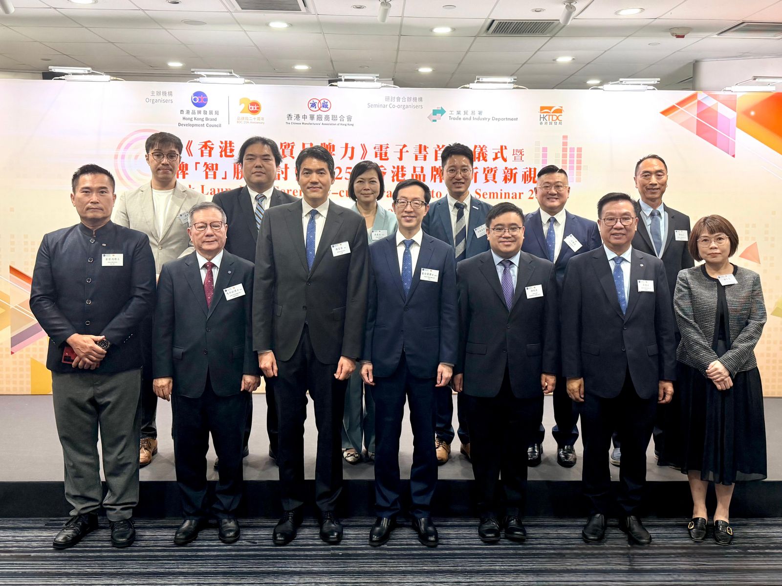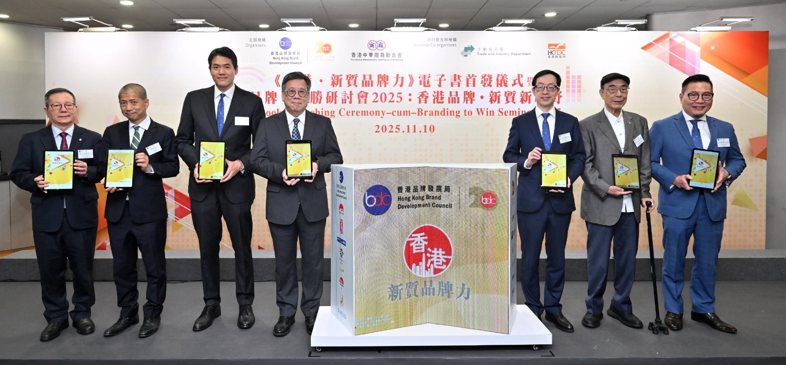 香港品牌发展局(品牌局)与香港中华厂商联合会(厂商会)今日(11月10日)假香港贸发局中小企服务中心举行《香港.新质品牌力》电子书首发仪式暨「品牌『智』胜研讨会2025」,邀得商务及经济发展局局长丘应桦担任主礼嘉宾,并联同厂商会会长卢金荣、品牌局主席陈家伟、品牌局荣誉主席杨孙西、知识产权署署长黄福来、品牌局荣誉主席史立德,以及厂商会常务副会长马介钦一同主持首发仪式,宣布《香港.新质品牌力》电子书正式出版,供业界及市民免费阅览。