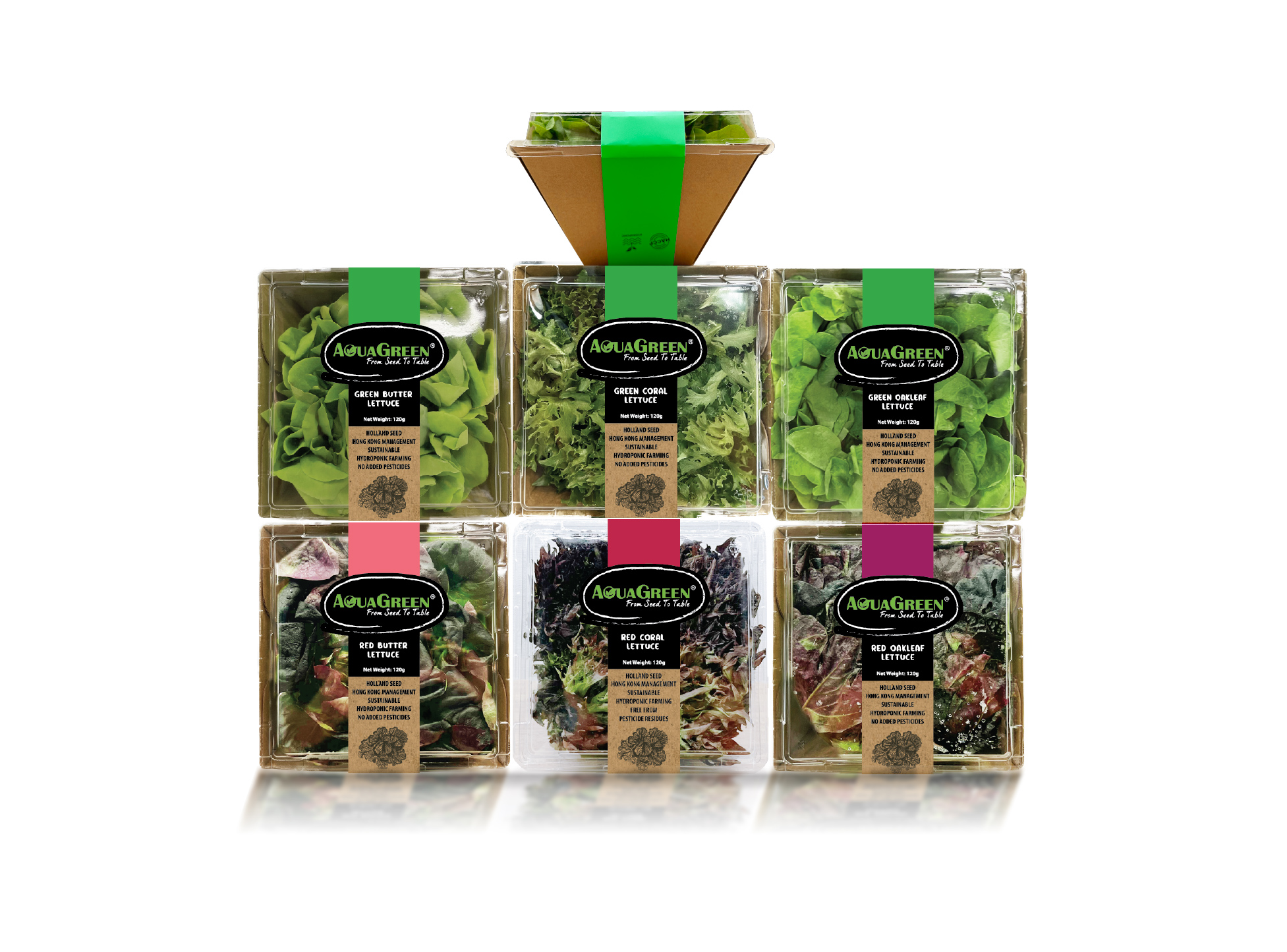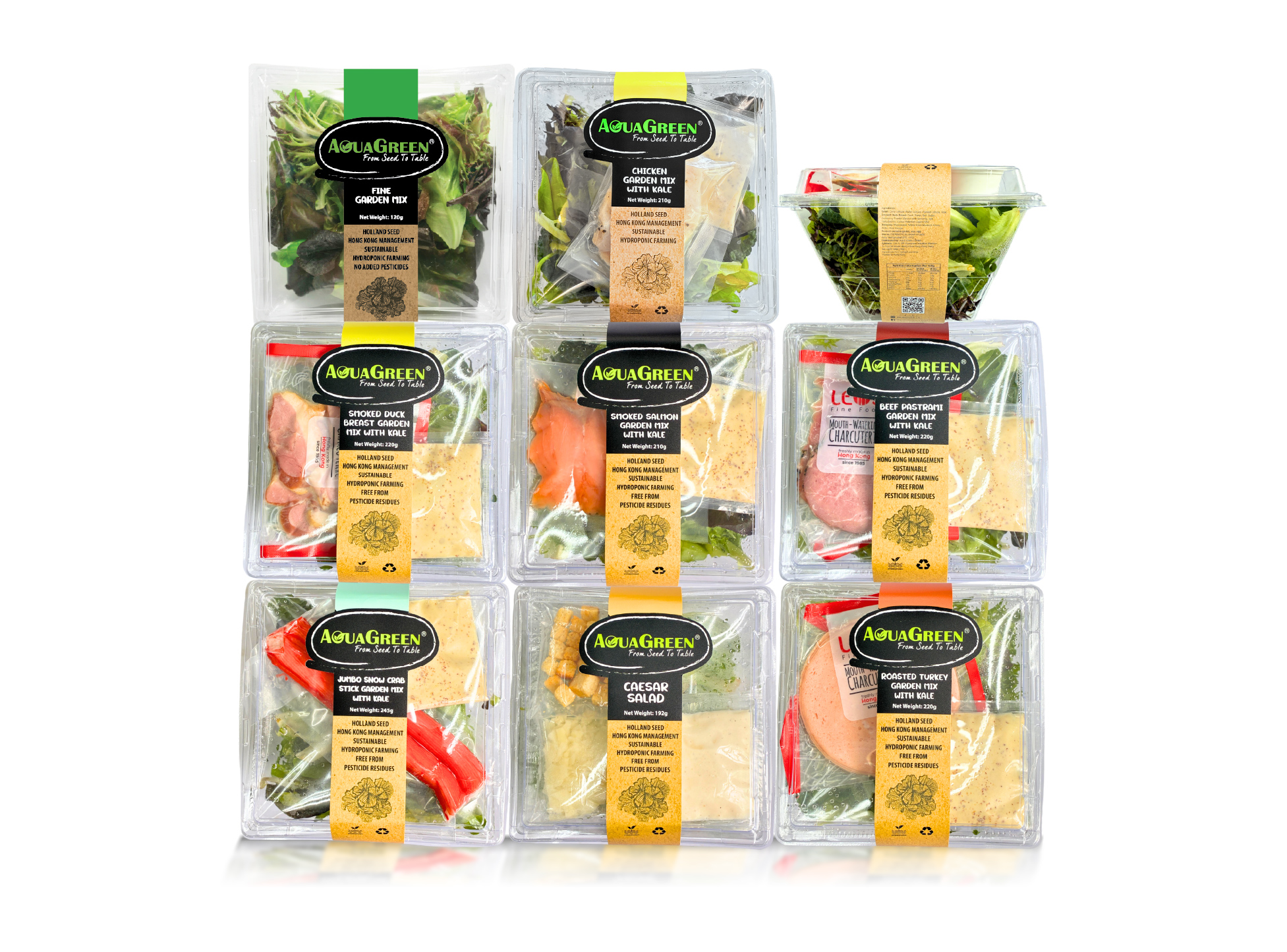 • 「AquaGreen」提供多款水耕的蔬菜與沙律產品,包含葉菜、生菜品種、羽衣甘藍、各類車厘茄、迷你甜椒、青瓜、以及各類西式與中式菜苗及菇菌等。品牌具有多年的專業種植經驗,不斷鑽研和創新,不但生產款式眾多,而且產量穩定,每天從農場運送超過 5,000公斤蔬菜到港。
