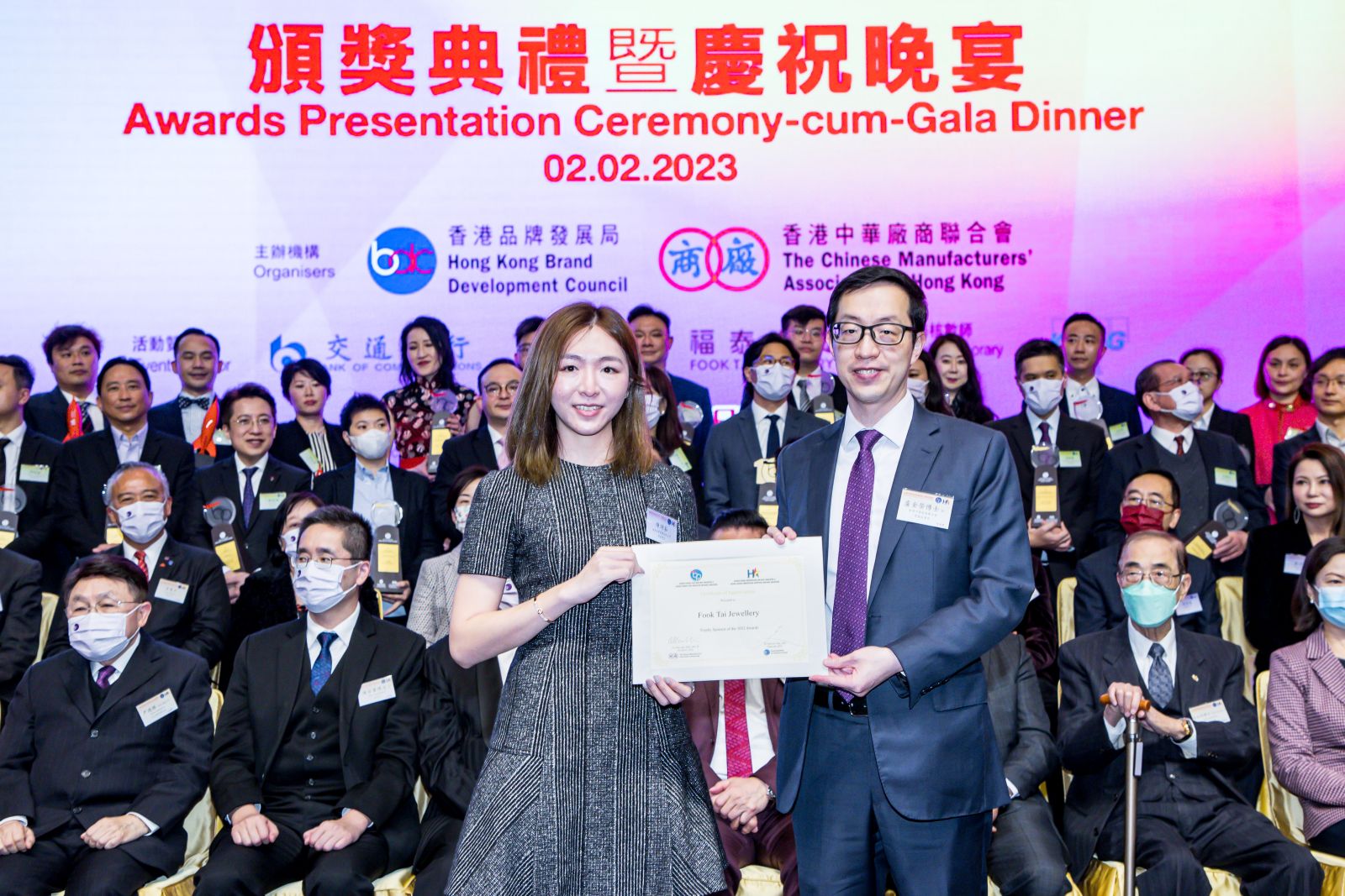 廠商會常務副會長兼品牌局副主席盧金榮致送感謝狀予2022獎座贊助商代表福泰珠寶集團有限公司副董事長陳詩茹(左)。