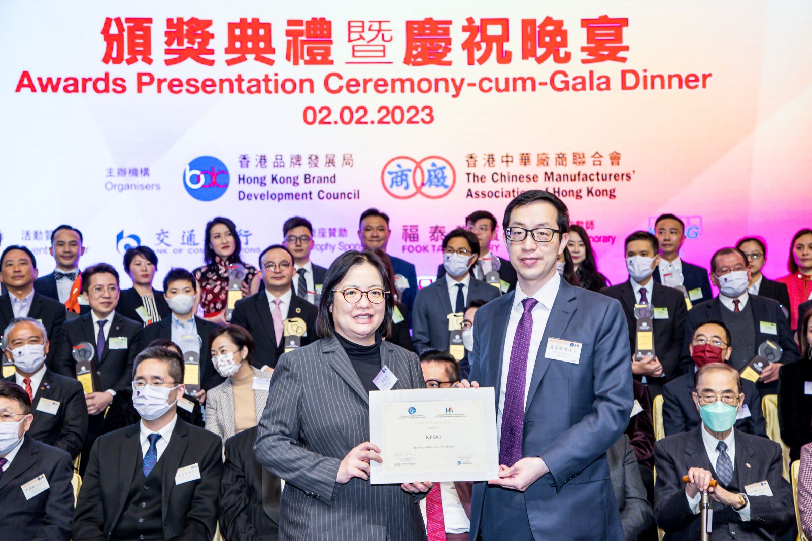 廠商會常務副會長兼品牌局副主席盧金榮致送感謝狀予2022義務核數師畢馬威會計師事務所審計合夥人方思穎(左)。